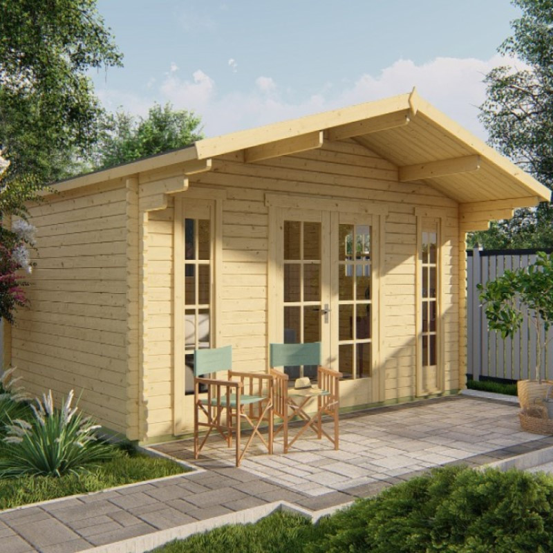 Chci individuální nabídkuZahradní chata Gustav je velká chata o vnějších rozměrech 500 x 500 cm. Její užitná plocha je 17,3 m2 a rozměry základů jsou 480 x 360 cm. Chata má klasickou sedlovou střechu, která přesahuje přes vchodové dveře o 120 cm. Dveře jsou široké 160 cm a jejich výška je 194 cm. Nejvyšší bod chaty je od země ve výšce 277 cm. Na každé straně vedle dveří je po jednom oknu, jedno okno je i v boční stěně. Okna u dveří mají rozměry 40 x 194 cm, okno v boční stěně je velké 86 x 71 cm a je otevíratelné. Okna jsou zasklena 4 mm silným jednovrstvým sklem a vyztužena dřevěnými latěmi.