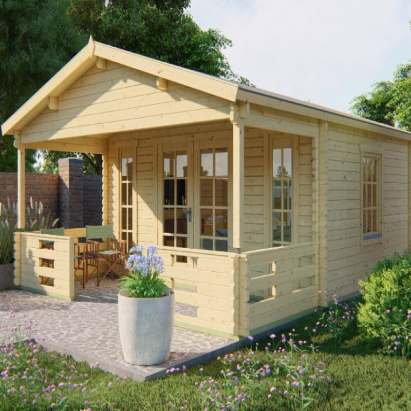 Chci individuální nabídkuZahradní chata Heino je velká chata se zastřešenou terasou o vnějších rozměrech 450 x 560 cm. Její užitná plocha je 15,8 m2 + 8,6 m2 terasa a rozměry základů jsou 430 x 540 cm. Chata má klasickou sedlovou střechu, která přesahuje přes celou terasu. Dveře jsou široké 159 cm a jejich výška je 199 cm. Nejvyšší bod chaty je od země ve výšce 275 cm. Na každé straně vedle dveří je po jednom oknu, jedno okno je navíc umístěno v boční stěně. Okna u dveří mají rozměry 40 x 188 cm, okno ve stěně je velké 77 x 112 cm a jsou zasklena izolačním dvojsklem 4-6-4 mm. Okna jsou vyztužena dřevěnými latěmi a okno v boční stěně je otevíratelné.