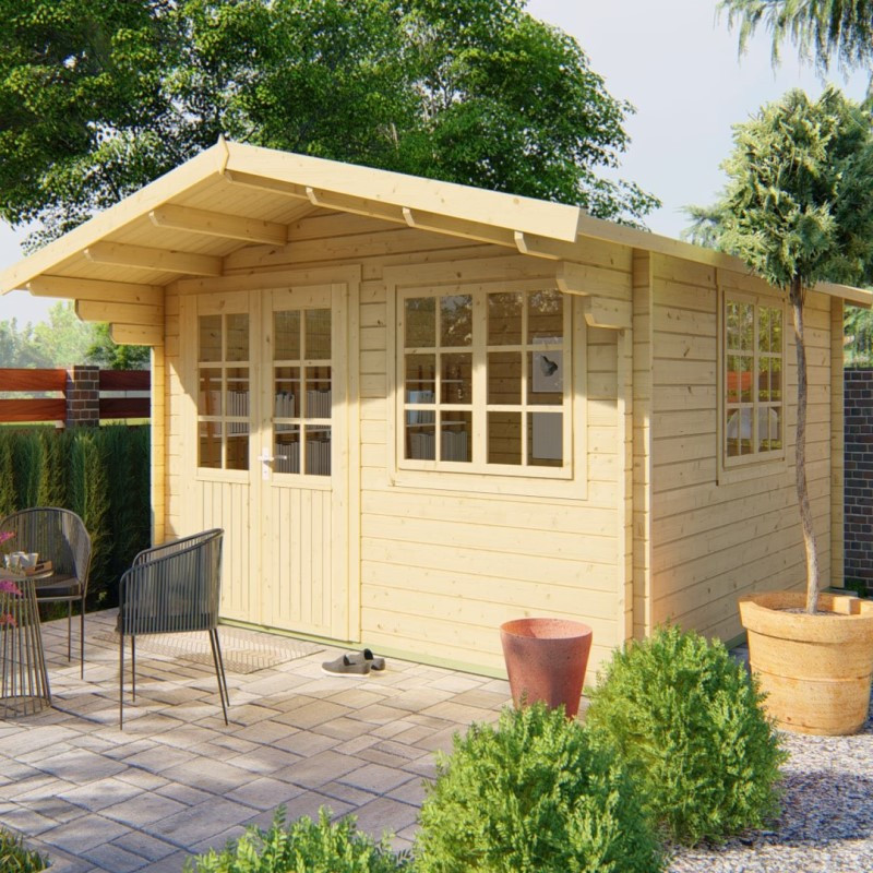 Chci individuální nabídkuZahradní chata Inge je velká chata o vnějších rozměrech 420 x 540 cm. Její užitná plocha je 16 m2 a rozměry základů jsou 400 x 400 cm. Chata má klasickou sedlovou střechu, která přesahuje přes vchodové dveře o 120 cm. Dveře jsou široké 151 cm a jejich výška je 200 cm. Nejvyšší bod chaty je od země ve výšce 250 cm. Vedle dveří je umístěno jedno dvoukřídlé okno, stejné okno je pak umístěno ještě v boční stěně. Tyto okna mají rozměry 131 x 102 cm a jsou zaskleny dvouvrstvým sklem o síle 4-6-4 mm. Skleněné tabule jsou vyztuženy dřevěnými latěmi.