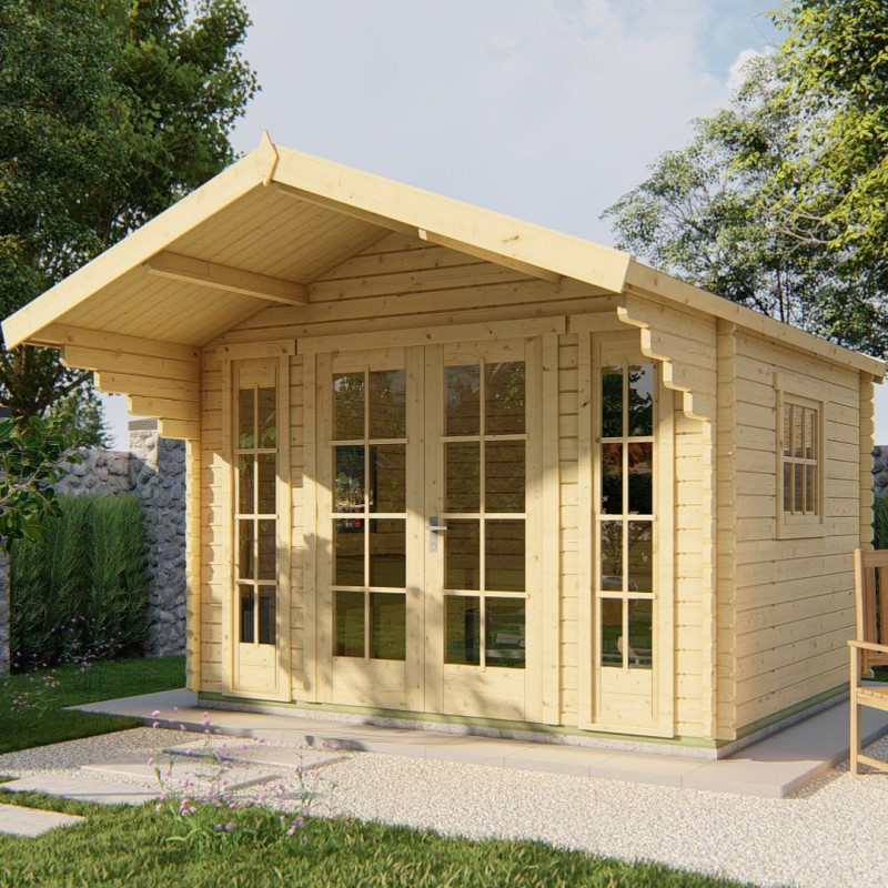 Chci individuální nabídkuZahradní chata Inglund je menší chata o vnějších rozměrech 380 x 470 cm. Její užitná plocha je 10,9 m2 a rozměry základů jsou 362 x 302 cm. Chata má klasickou sedlovou střechu, která přesahuje přes vchodové dveře o 150 cm. Dveře jsou široké 161 cm a jejich výška je 196 cm. Nejvyšší bod chaty je od země ve výšce 263 cm. Na každé straně vedle dveří je po jednom oknu, jedno je umístěno v boční stěně. Okna vedle dveří mají rozměry 42 x 189 cm, boční okno je velké 87 x 67 cm. Okna jsou zasklena 4 mm silným jednovrstvým sklem. Okna jsou vyztužena dřevěnými latěmi a okno v boční stěně je otevíratelné.