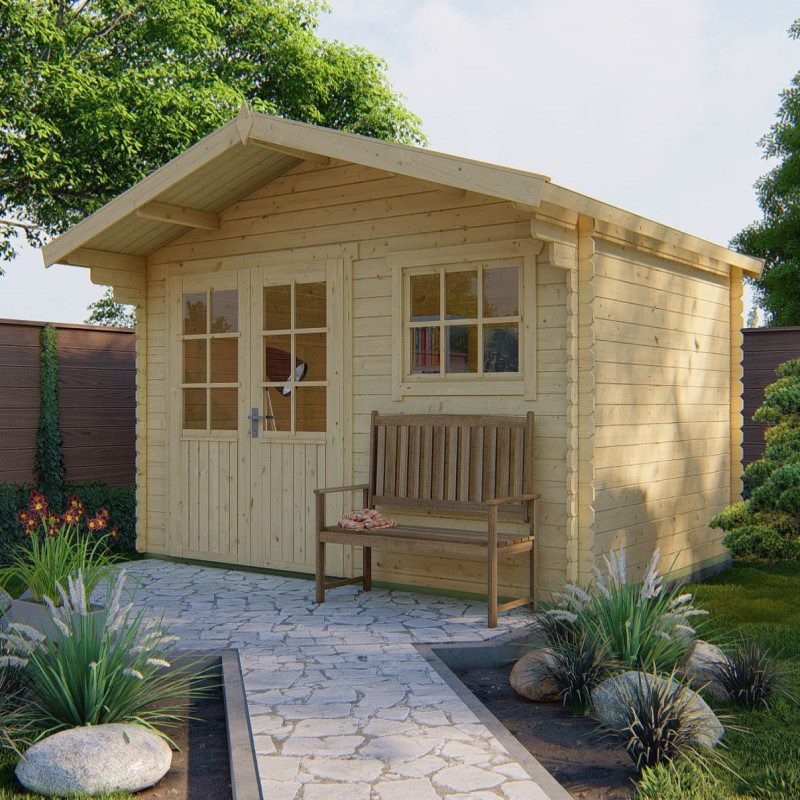 Chci individuální nabídkuZahradní chata Ingmar je menší chata o vnějších rozměrech 380 x 370 cm. Její užitná plocha je 10,2 m2 a rozměry základů jsou 362 x 282 cm. Chata má klasickou sedlovou střechu, která přesahuje přes vchodové dveře o 80 cm. Dveře jsou dvoukřídlé, široké 161 cm a jejich výška je 192 cm. Nejvyšší bod chaty je od země ve výšce 258 cm. Vedle dveří je umístěno jedno okno. Okno má rozměry 87 x 66 cm a je zaskleno 4 mm silným jednovrstvým sklem. Okno je vyztuženo dřevěnými latěmi a je otevíratelné.