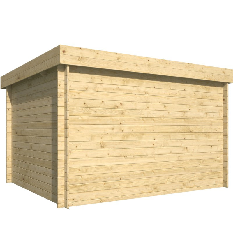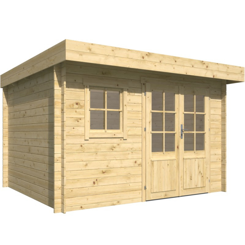 Chci individuální nabídkuZahradní chata Marta je menší chata o vnějších rozměrech 358 x 298 cm. Její užitná plocha je 9,5 m2 a rozměry základů jsou 338 x 278 cm. Chata má rovnou střechu, která je vyrobena z OSB desek a přesahuje přes vchodové dveře. Dveře jsou široké 150 cm, dvoukřídlé a jejich výška je 177 cm. Nejvyšší bod chaty je od země ve výšce 211 cm. Na boční straně vedle dveří je neotevíratelné okno s rozměry 70 x 70 cm, je zaskleno 4 mm silným jednovrstvým sklem a vyztuženo dřevěnými latěmi.