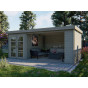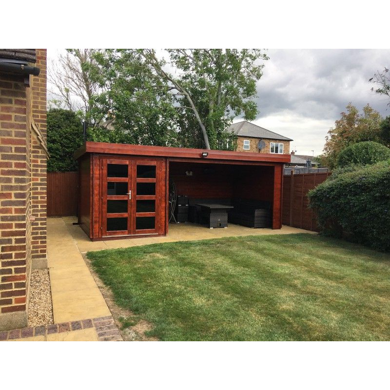 Chci individuální nabídkuZahradní chata Megamodern je menší chata s velkým přístřeškem o vnějších rozměrech 575 x 300 cm. Její užitná plocha je 5,5 m2 + 10,7 m2 plocha přístřešku. Rozměry základů jsou 565 x 290 cm. Chata má plochou střechu, která přesahuje do boku 365 cm. Dvoukřídlé dveře jsou široké 143 cm a jejich výška je 188 cm. Nejvyšší bod chaty je od země ve výšce 228 cm. Dveře jsou zaskleny 4 mm silným jednovrstvým sklem.