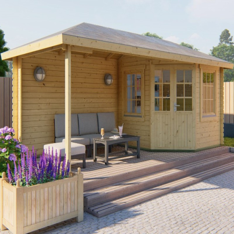 Chci individuální nabídkuZahradní chata Niklas je menší chata o vnějších rozměrech 575 x 250 cm. Její užitná plocha je 5,3 m2 + 7,0 m2 terasa a rozměry základů jsou 555 x 230 cm. Chata má valbovou střechu s přesahem 26 cm. Dveře jsou široké 120 cm a jejich výška je 188 cm. Nejvyšší bod chaty je od země ve výšce 259 cm. Na každé straně vedle dveří je po jednom oknu. Každé okno má rozměry 77 x 112 cm a je zaskleno 4 mm silným jednovrstvým sklem. Okna jsou vyztužena dřevěnými latěmi a jsou otevíratelná. Zastřešená terasa u chaty má rozměry 250 x 325 cm a perfektně se hodí pro večerní posezení s rodinou a přáteli.