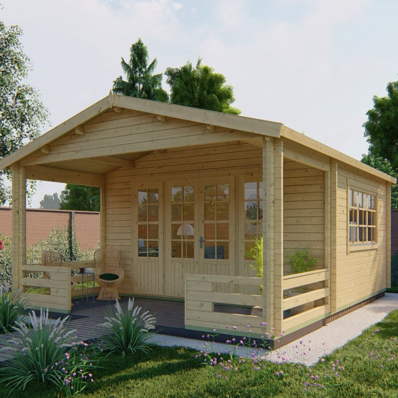 Chci individuální nabídkuZahradní chata Nottingham je větší chata o vnějších rozměrech 540 x 440 cm a velkou terasou o rozměru 540 x 223 cm. Její užitná plocha je 21,8 m2, plocha terasy pak 11,4 m2. Chata má klasickou sedlovou střechu, která přesahuje přes celou délku terasy. Dveře jsou dvoukřídlé o šířce 159 cm a jejich výška je 194 cm. Nejvyšší bod chaty je od země ve výšce 276 cm. Na každé straně vedle dveří je po jednom oknu. Okna jsou o rozměru 78 x 194 cm výplň tvoří izolační dvojsklo 4 - 6 - 4 mm (sklo vzduch sklo). V boční stěně okno o rozměru 213 x 96 cm. Okno je vyztuženo dřevěnými latěmi a je otevíratelné.