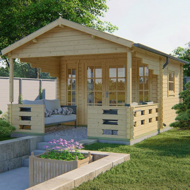 Chci individuální nabídkuZahradní chata Sanstrov je velká chata s terasou o vnějších rozměrech 380 x 590 cm. Její užitná plocha je 10,8 m2 uvnitř chaty a 9,7 m2 na terase. Rozměry základů jsou 360 x 570 cm. Chata má klasickou sedlovou střechu, která přesahuje přes celou terasu. Dveře jsou široké 159 cm a jejich výška je 188 cm. Nejvyšší bod chaty je od země ve výšce 270 cm. Na každé straně vedle dveří je po jednom oknu, další okno je v boční stěně chaty. Okna vedle dveří mají rozměry 40 x 188 cm, okno v boku chaty je velké 68 x 85 cm a jsou zaskleny 4 mm silným jednovrstvým sklem. Okna jsou vyztužena dřevěnými latěmi a okno v boční stěně je otevíratelné.
