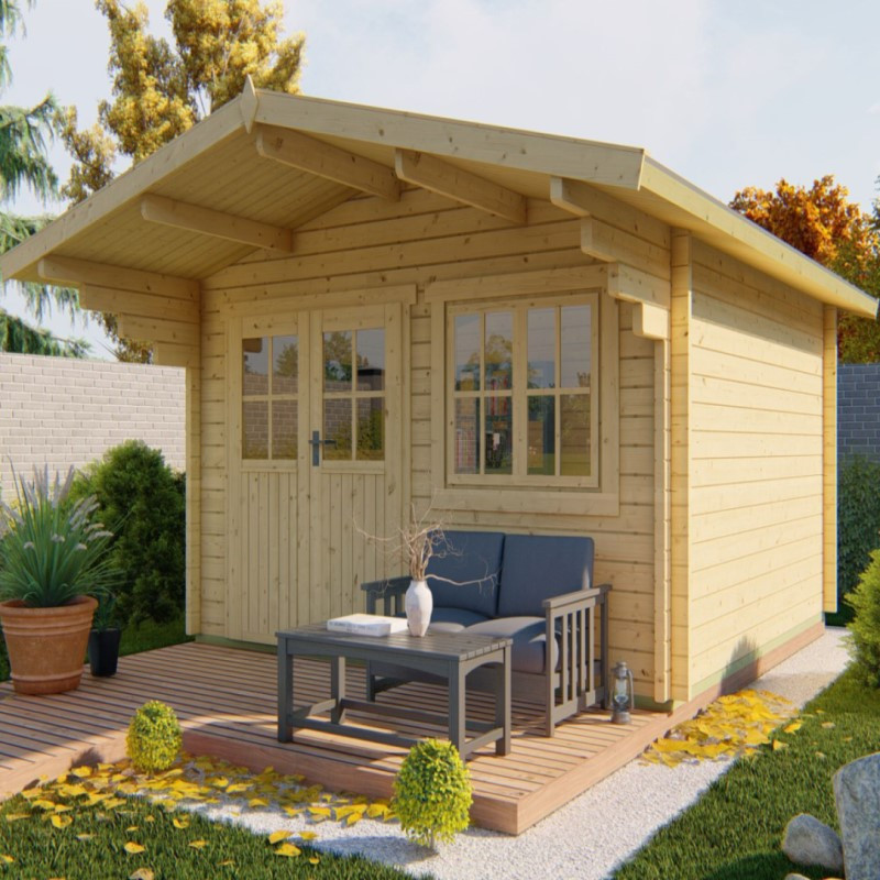 Chci individuální nabídku,Zahradní chata Stian je středně velká chata o vnějších rozměrech 400 x 530 cm. Její užitná plocha je 13,5 m2 a rozměry základů jsou 380 x 380 cm. Chata má klasickou sedlovou střechu, která přesahuje přes vchodové dveře o 140 cm. Dveře jsou široké 154 cm a jejich výška je 182 cm. Nejvyšší bod chaty je od země ve výšce 250 cm. Vedle dveří je umístěno jedno otevíratelné okno o rozměrech 110 x 93 cm. Všechna okna jsou dvouvrstvá o síle 4 - 6 - 4 mm (sklo - vzduch - sklo) a jsou vyztužena dřevěnými latěmi.