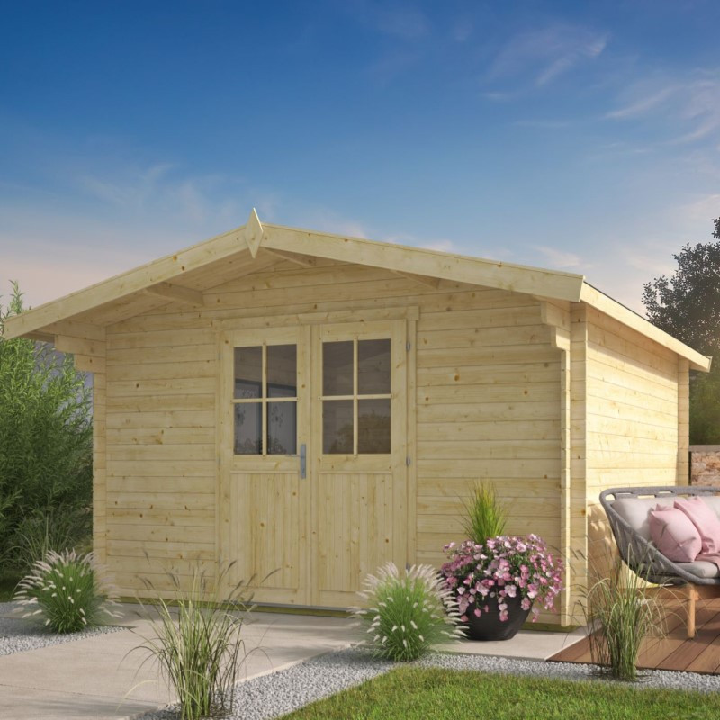 Chci individuální nabídkuZahradní chatka Torrent je středně velká dřevostavba o vnějších rozměrech 400 x 470 cm. Její užitná plocha je 14,1 m2 a rozměry základů jsou 382 x 382 cm. Chata má klasickou sedlovou střechu, která přesahuje přes vchodové dveře o 70 cm. Dveře jsou dvoukřídlé široké 164 cm a jejich výška je 190 cm. Dveře jsou částečně prosklené jednoduchým sklem silným 4 mm. Zasklení je vyztuženo dřevěnými latěmi. Nejvyšší bod chatky od země je ve výšce 236 cm.