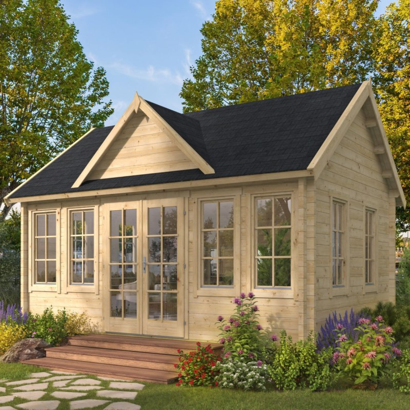Chci individuální nabídkuZahradní chata Trevor je větší prosklená chata o vnějších rozměrech 550 x 400 cm. Její užitná plocha je 20,1 m2 a rozměry základů jsou 362 x 282 cm. Chata má klasickou sedlovou střechu, prosklené dvoukřídlové dveře jsou 151 cm široké a 196 cm vysoké. Nejvyšší bod chaty je od země ve výšce 351 cm, díky čemuž je uvnitř opravdu prostorná. Na každé straně vedle dveří jsou dvě a z každého boku jsou další dvě. Každé okno má rozměry 71 x 122 cm a všech 8 lze otevřít a jsou zasklena dvojvrstvými skly o síle 3 - 6 - 3 mm (sklo - vzduch - sklo). Okna jsou vyztužena dřevěnými latěmi.