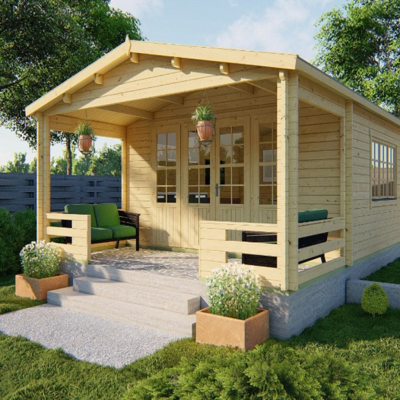 Chci individuální nabídkuZahradní chata Wigan je větší chata, vhodná i pro víkendový pobyt. Vnější rozměry činí 540 x 763 cm. Užitná plocha je 27 m2, plocha terasy je pak 11,4 m2. Rozměr základů tvoří 540 x 743 cm. Chata má klasickou sedlovou střechu, která zakrývá i celou plochu terasy. Dvoukřídlé vstupní dveře jsou široké 159 cm a jejich výška je 188 cm. Nejvyšší bod chaty je od země ve výšce 259 cm. Na každé straně vedle dveří je po jednom oknu. Okna májí rozměry 78 x 188 cm a jsou zasklená izolačním dvojsklem 4 - 16 - 4 mm (sklo vzduch sklo). Okna jsou vyztužena dřevěnými latěmi. V boční stěně chaty je velké otevíratelné okno s rozměry 213 x 96 cm.