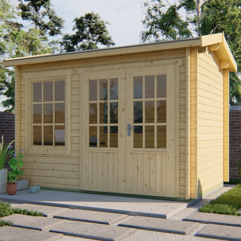 Chci individuální nabídkuZahradní domek Daisy je středně velký zahradní domek s užitnou plochou 7,6 m2. Vnější rozměry domku jsou 350 x 250 cm, rozměry základů domku jsou pak 330 x 230 cm. Výška domku v hřebenu je 243 cm. Domek je vybaven dvoukřídlými dveřmi se skleněnou výplní a klasickou klikou se spolehlivým zámkem. Vedle dveří je umístěno jedno velké okno s rozměry 87 x 125 cm. Okno je vyztužené dřevěnými latěmi a je otevíratelné. Výplň dveří i okna je z dvouvrstvého skla o síle 3 - 6 - 3 mm (sklo - vzduch - sklo). Šířka dveří je 162 cm a jejich výška je pěkných 189 cm. Střecha domku je klasická sedlová a její celková plocha činí 11,5 m2.