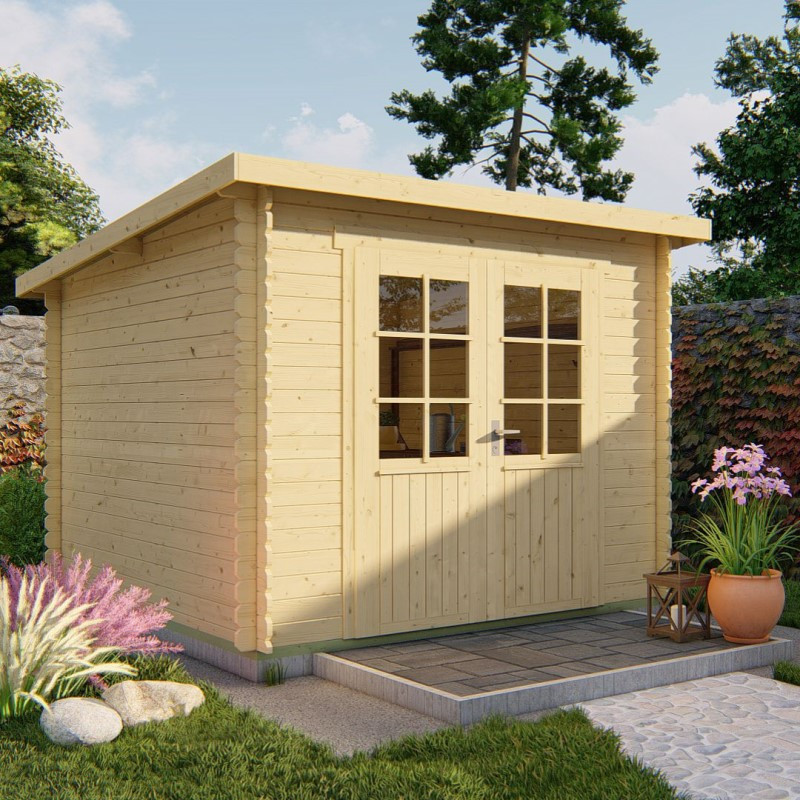 Chci individuální nabídkuZahradní domek s pultovou střechou Jörgen má vnější rozměry 290 x 290 cm. Jeho výška v nejvyšším bodě činí 219 cm. Základy domku mají rozměry 270 x 270 cm. Vnitřní užitná plocha zahradního domku je 7,3 m2. Domek je osazen dvoukřídlými dveřmi o celkové šířce 162 cm a výšce 188 cm. Dveře jsou zaskleny jednovrstvým sklem o síle 4 mm, které je zpevněno dřevěnými latěmi. K zabezpečení dveří je použita klasický klika se zámkem. Domek nemá okna.