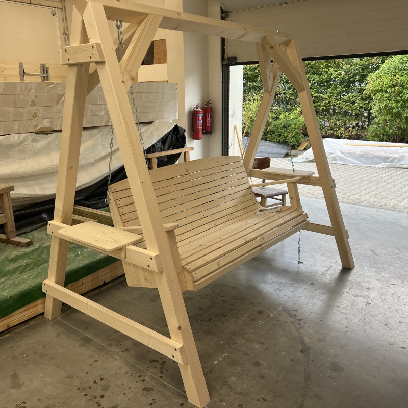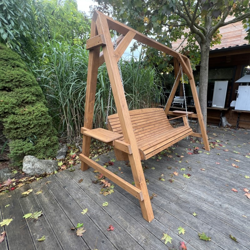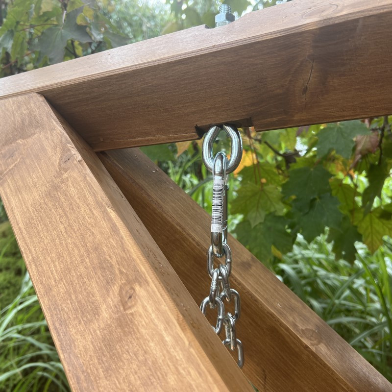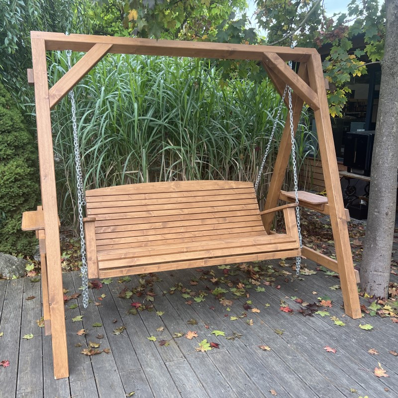 Houpačka je vyrobena z hoblovaných smrkových hranolů. Smrkové dřevo lze snadno povrchově upravit – např. lazurou, olejem nebo barvou podle stylu zahrady. Úpravu provádíme za příplatek a na přání zákazníka.
