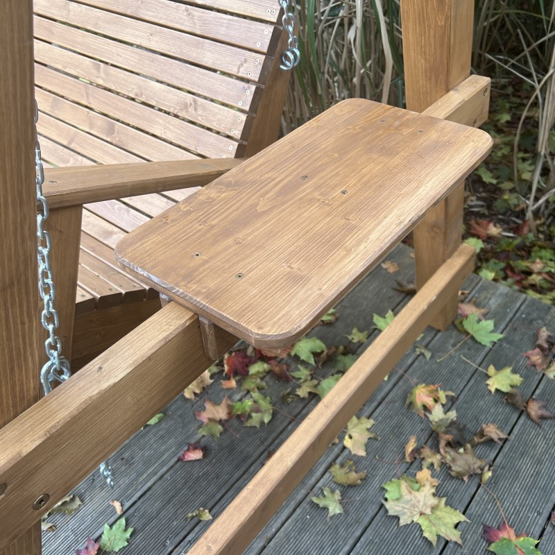 Díky širokým nohám ve tvaru „A“ je houpačka stabilní a pevná i při větším houpání. Houpačka je bez stříšky, ale po obou stranách je doplněna odkládací plochou třeba pro rozečtenou knihu.
