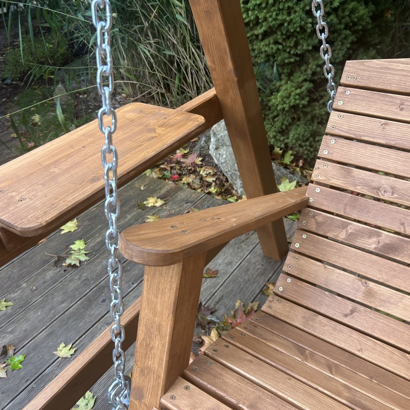 Houpací dřevěná lavička je ergonomicky tvarovaná a po stranách má pohodlné područky. Pro vyšší komfort lze houpačku doplnit textilními polštáři. Houpací lavice je zavěšena na pozinkovaných řetězech.