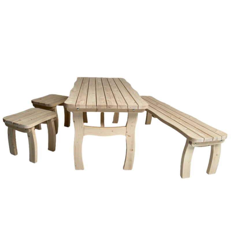 Masivní zahradní nábytek řady Ibiza se vyznačuje exotickým designem a výjimečnou kvalitou zpracování. Hrany nábytku jsou zdobeny vlnkami, nohy nábytku pak zdobí mírné prohnutí. Díky své velikosti je vhodný na chaty a chalupy a do velkých zahrad. V nabídce máme masivní stůl s deskou 80 x 160 cm, lavici s opěrkou nebo bez opěrky o délce 150 cm, křesla bez područek o šířce 60 cm a stoličky o šířce 60 cm ze smrkových hranolů o síle 4 cm.