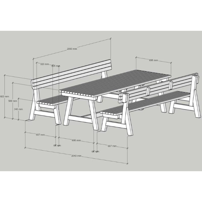 Deska stolku je 70 x 200 cm a tvoří ji hladce hoblované hranoly o průřezu 50 x 23 mm. Pro podnože stolu se využívá hranolů o průřezu 43 x 68 mm.