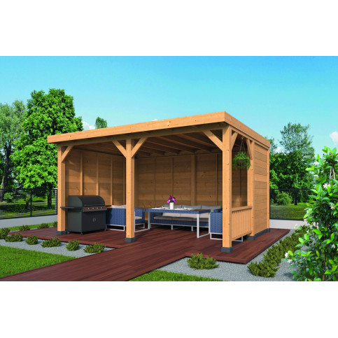 Zastřešená dřevěná pergola Wezep je prostorný a elegantní přístřešek z modřínového dřeva 14x14 cm s plochou střechou a rozměry 500 x 400 x 262 cm. Je skvěle využitelná nejen na letní posezení u grilu, ale také jako přístřešek na uskladnění motorek či zahradního nářadí. Ze tří stran je pergola kryta proti větru stěnou z modřínových prken, které mohou být buď z přírodního modřínu, nebo v černé barvě.