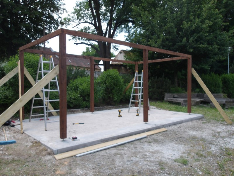 Nosná konstrukce altánu je vyrobena z robustních stojek o průřezu 11,5 × 11,5 cm, které jsme kotvili do zámkové dlažby pomocí výškově stavitelného nerezového kování. Tento způsob uchycení zajišťuje nejen stabilitu, ale i precizní dorovnání konstrukce na mírně nerovném terénu.