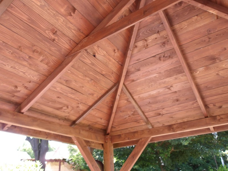 Všechny dřevěné části altánu Corfu byly na naší lakovně nejprve impregnovány a následně opatřeny dvěma vrstvami tenkovrstvé lazury Xyladecor Classic HP, která zvýraznila krásnou strukturu modřínu a zároveň poskytuje vysokou ochranu před povětrnostními vlivy.