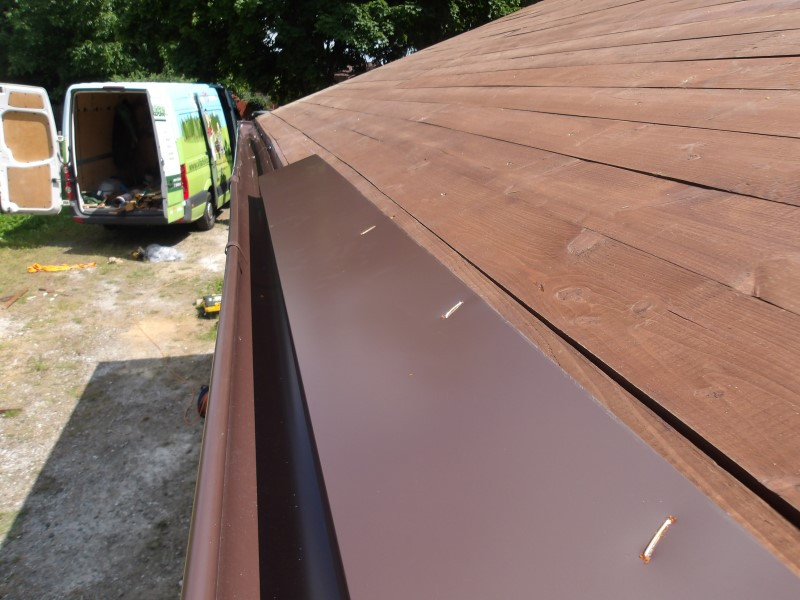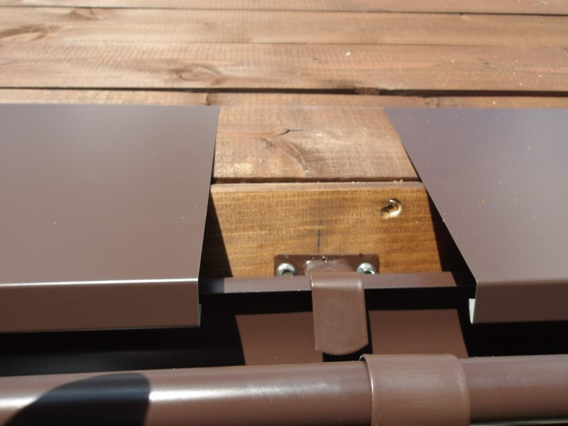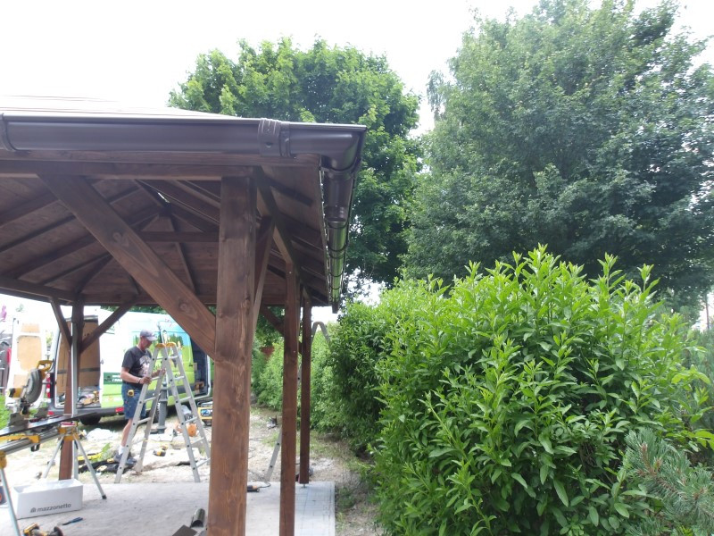Na palubkový záklop střechy jsme položili podkladový pás Ondutiss Strong, který chrání střechu před vlhkostí, a finální vrstvu tvoří asfaltový šindel ve tvaru obdélníku. Střešní konstrukce je zakončena okapnicí a lakovaným plechovým okapovým systémem, který odvádí dešťovou vodu mimo prostor altánu.
