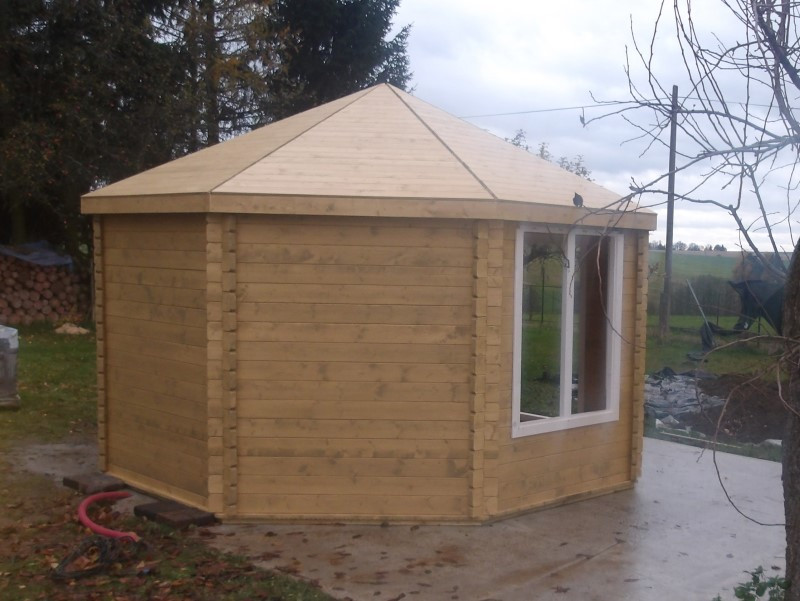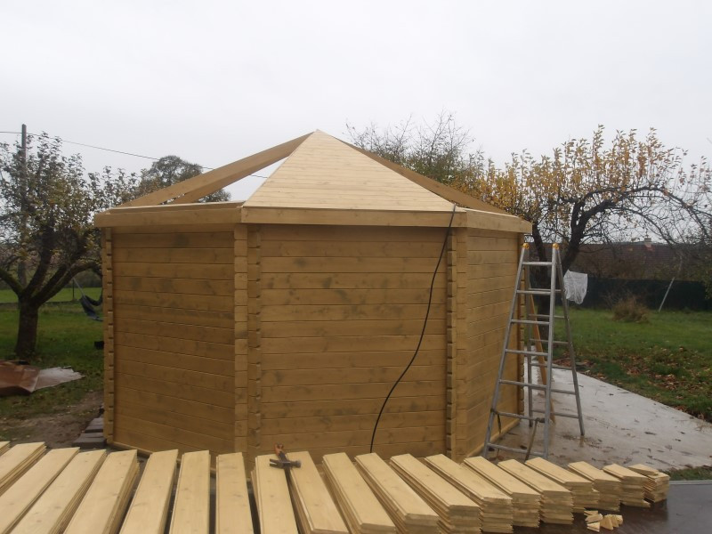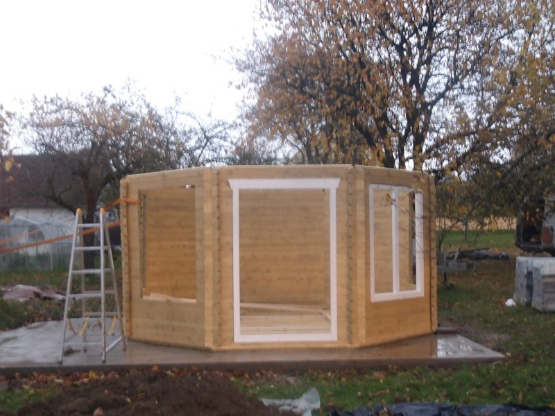 Altán jsme stavěli na připravený betonový podklad, na který jsme složili podkladní rošt z impregnovaných hranolů a na něj sestavili podlahu ze smrkových palubek o síle 28 mm. Hotová podlaha byla následně po obvodu olištována, aby působila čistě a esteticky i v interiéru. Altán má dvoukřídlé prosklené dveře a dvě velká boční okna. Zasklení je provedeno izolačním dvojsklem 4–6–4 mm, takže uvnitř je příjemné světlo a zároveň lepší tepelná izolace.