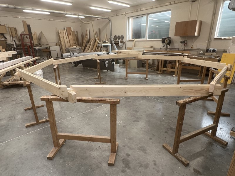 Aby se impregnace i lazura dostaly do všech spojů a hran, ošetřili jsme altánek ještě v rozloženém stavu na naší lakovně. Tento postup je klíčový pro dlouhou životnost stavby, protože zabraňuje pronikání vlhkosti i případnému napadení dřeva. Dřevo altánu jsme ošetřili lazurou Tikkurila Vallti v odstínu 5064, dveře, okna a zárubně barvou bílou.