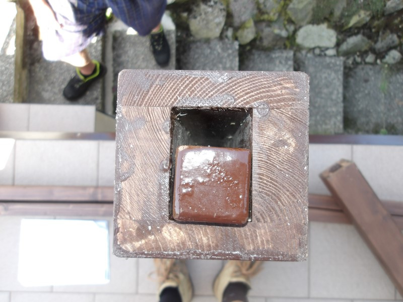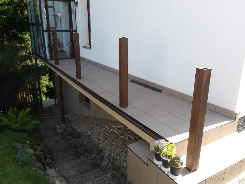 Na přední terase byly kovové držáky původního zábradlí kotvené přímo do podlahy, na zadní terase pak připevněné z boku. Místo složité výměny jsme se rozhodli tyto prvky prakticky využít. Naši truhláři vyrobili speciální dřevěné tubusy – hranoly 94 × 94 mm, dlouhé 100 cm, do kterých byl v celé délce vyvrtán otvor. Díky tomu se dal tubus snadno navléknout na původní kovový držák a stal se tak pevným základem pro nové zábradlí.
