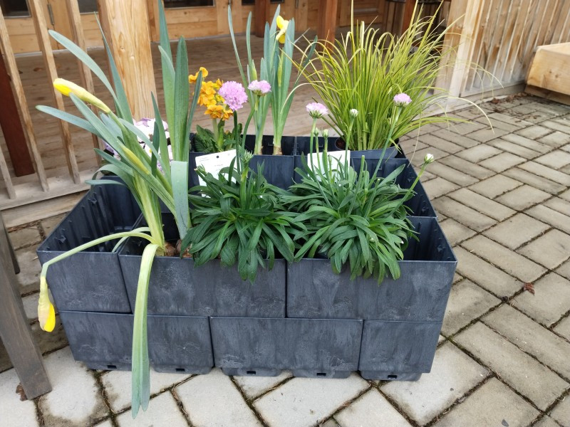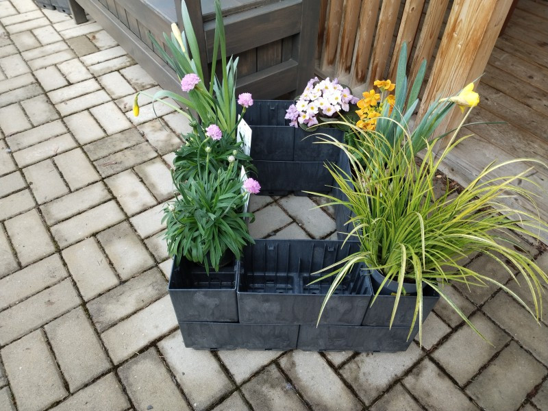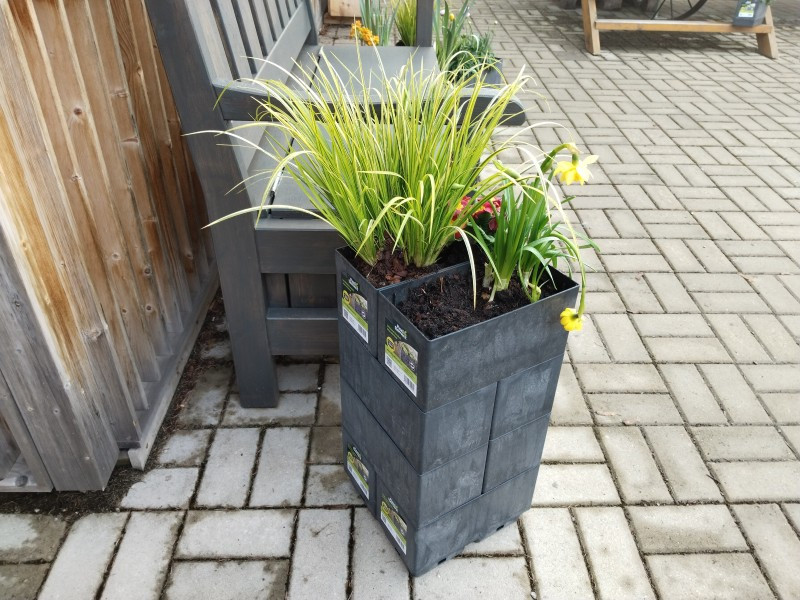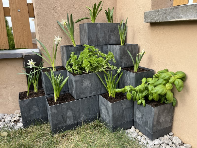 Složenou stavebnici truhlíků Flexi Element lze použít i na terasu nebo balkon. Při nedostatku místa se z ní dá sestavit úzký a vysoký čtverec, obdélník nebo pyramida. V tomto případě je však nutné nejspodnější řadu truhlíků podložit miskami. Na jeden truhlík, dvě misky.