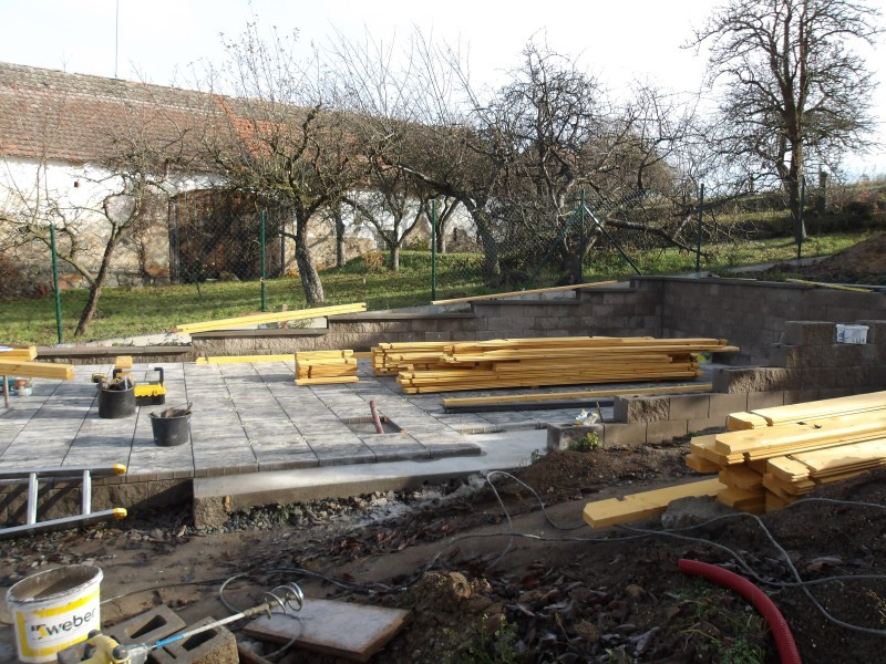 Nejnáročnějším bodem realizace byl bezpochyby prodloužený přední přesah střechy, který byl z estetických i praktických důvodů prodloužen téměř o tři metry. Abychom zajistili jeho stabilitu, bylo nutné vytvořit pevné podepření pomocí smrkových hranolů, které jsme následně bezpečně ukotvili do betonového podkladu pomocí ocelových patek s roxorem. Díky tomu má celá konstrukce vysokou pevnost, odolnost proti větru i perfektní statiku.