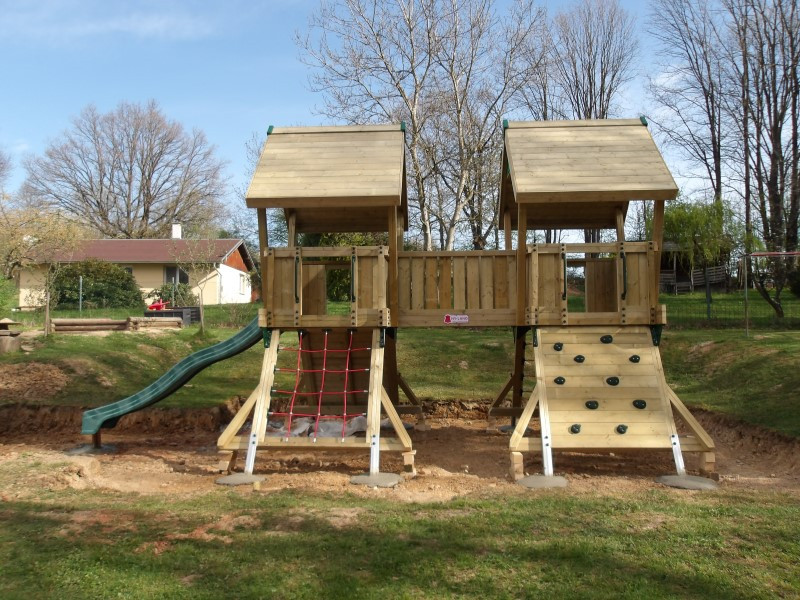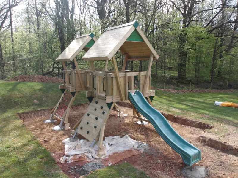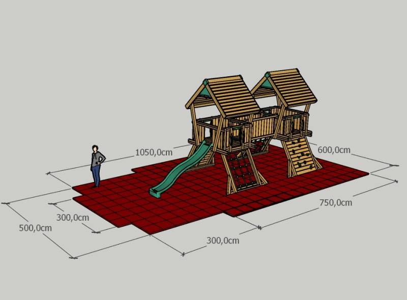 Dopadová plocha kolem dětské věže je nedílnou součástí a může být vyplněna jemným pískem, kačírkem, drcenou kůrou nebo pryžovými dlaždicemi. Aby děti padaly do měkkého :-))) Navíc má věž vymezený bezpečnostní prostor 10,6 × 6,1 metru, kde mají děti dost místa pro běhání, lezení a samozřejmě skluzování.