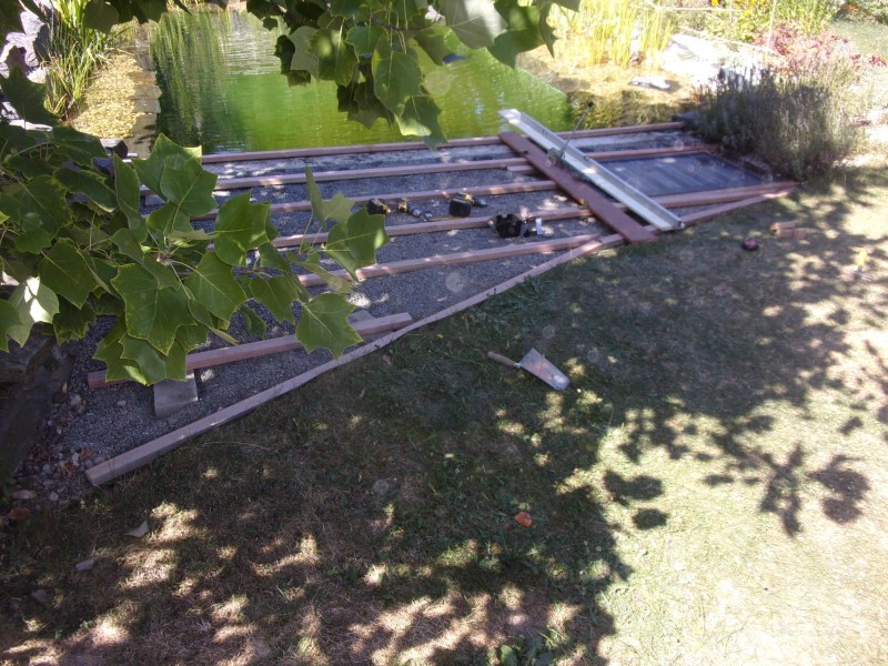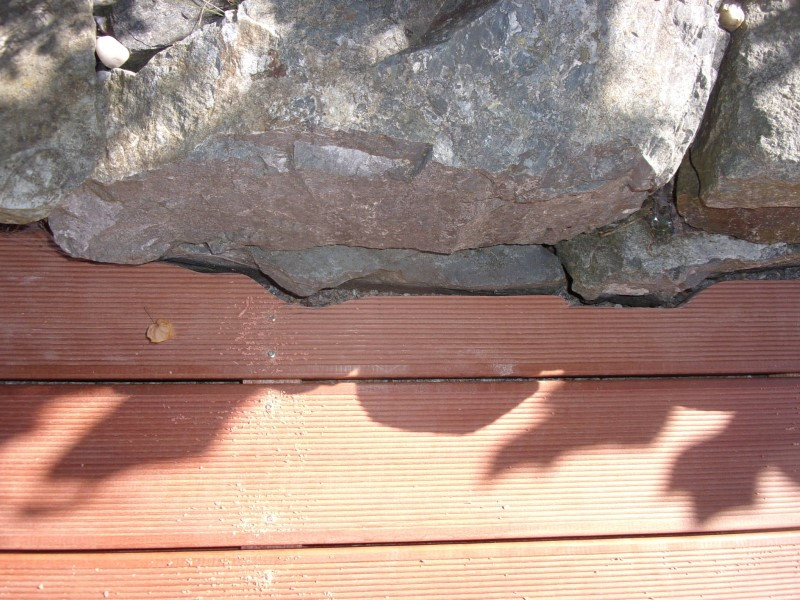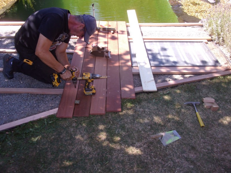 Základ pod molo tvořil drobný štěrk a betonové dlaždice, na které jsme umístili rošt z impregnovaných hranolů z tvrdého dřeva. Na tento rošt jsme pomocí nerezových vrutů připevnili terasová prkna, mezi kterými jsme ponechali větrací mezeru kvůli odvodu vlhkosti a správné cirkulaci vzduchu.