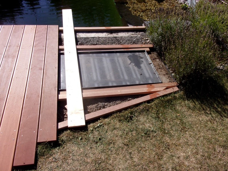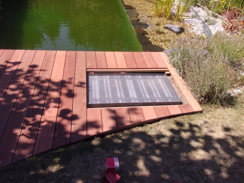 Součástí přírodního jezírka je také filtrační šachta, kterou bylo nutné zakrýt, ale zároveň zachovat přístup pro údržbu. Vyrobili jsme proto dřevěný poklop s panty z nerezové oceli, který lze snadno otevírat.