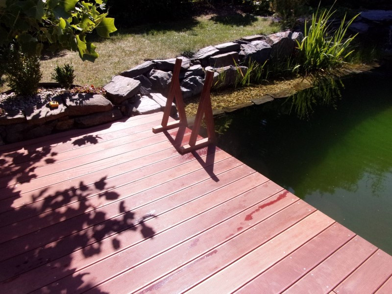 Zákaznice Petra nás oslovila s přáním postavit k jejímu přírodnímu jezírku nové koupací molo. Požadavkem bylo nejen pohodlné a bezpečné řešení pro vstup do vody, ale také esteticky hodnotný prvek, který zapadne do přírodního rázu celé zahrady. Výsledkem je elegantní venkovní molo z exotického dřeva Massaranduba, které jsme navrhli a postavili zcela na míru.