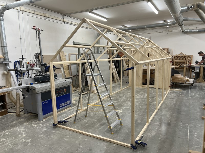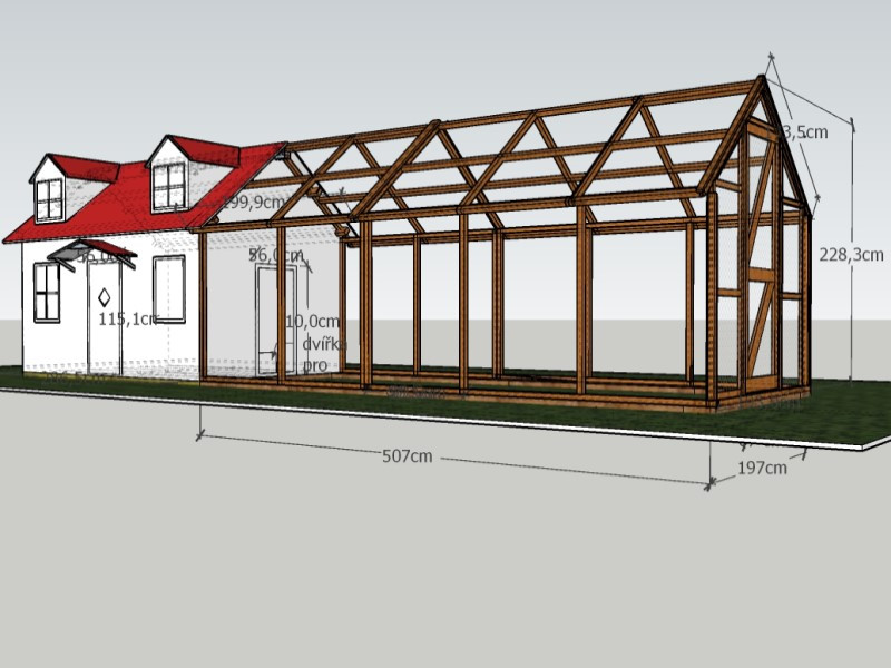 Na domeček bude podle návrhu našeho kolegy navazovat prostorná voliéra bez zastřešení o velikosti 507 × 197 cm, výškově sjednocená s domečkem na 228 cm. Rám voliéry jsme vyrobili z hoblovaných smrkových hranolů se sraženými hranami, aby konstrukce působila čistě a příjemně.