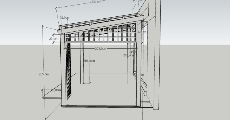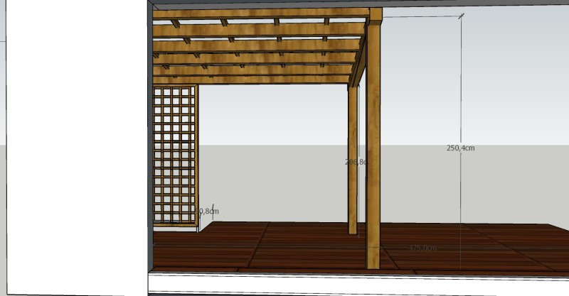 Střecha pergoly je tvořena dřevěným roštem, který je navržen ve sklonu, aby umožnil přirozený odvod vody i růst popínavých rostlin. Zákazník totiž plánuje využít pergolu i jako oporu pro zeleň, která časem poskytne příjemný stín.