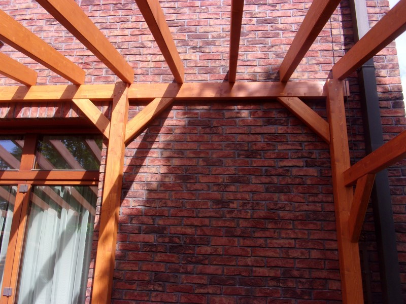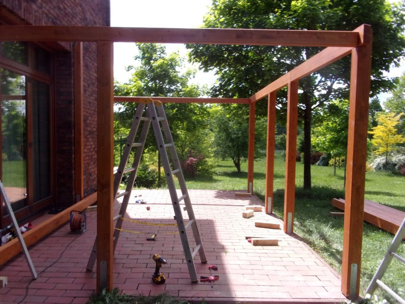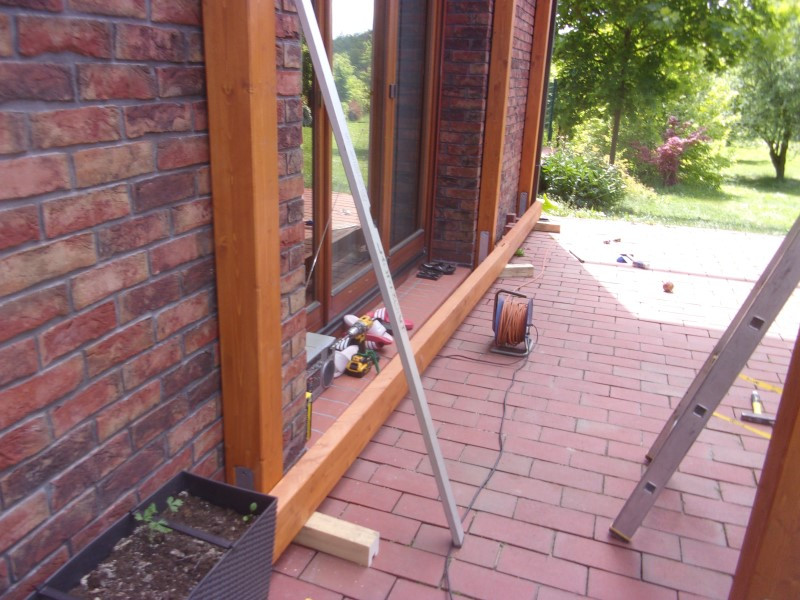 Pergolu jsme postavili jako samostatně stojící bez upevnění ke stěně domu. Vzhledem k tomu, že byla pergola umístěna na terasu ze zámkové dlažby, bylo nutné zajistit její kotvení na dvojité "H" úchyty z pozinkované oceli. Tyto zabetonované úchyty zajistí maximální stabilitu při jakémkoli počasí.