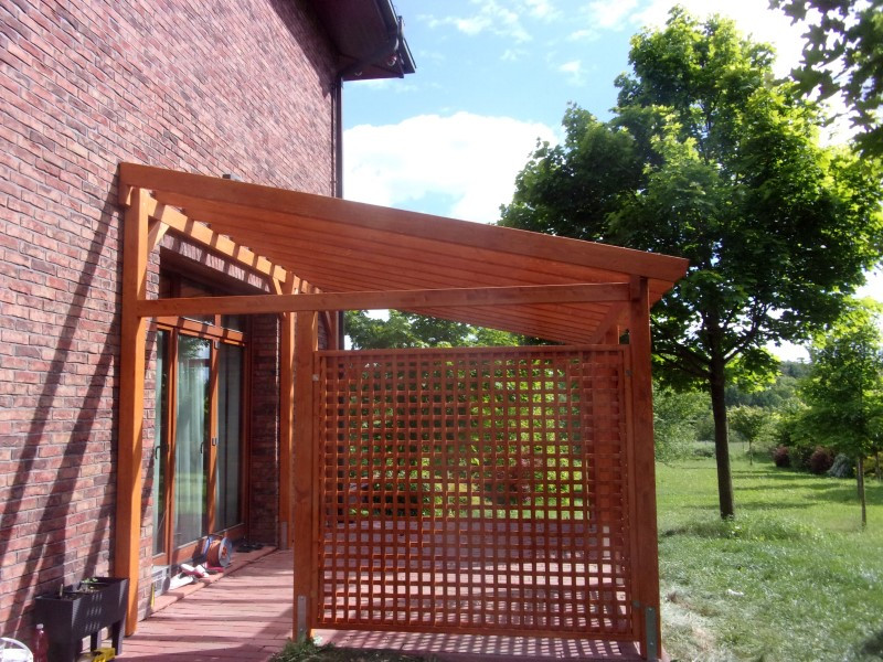 Všechny dřevěné prvky byly nejprve napuštěny impregnací a poté ošetřeny kvalitní lazurou Tikkurila Guard, která chrání dřevo proti slunci, dešti i škůdcům. Tato povrchová úprava zajišťuje dlouhou životnost pergoly i bez nutnosti časté údržby.