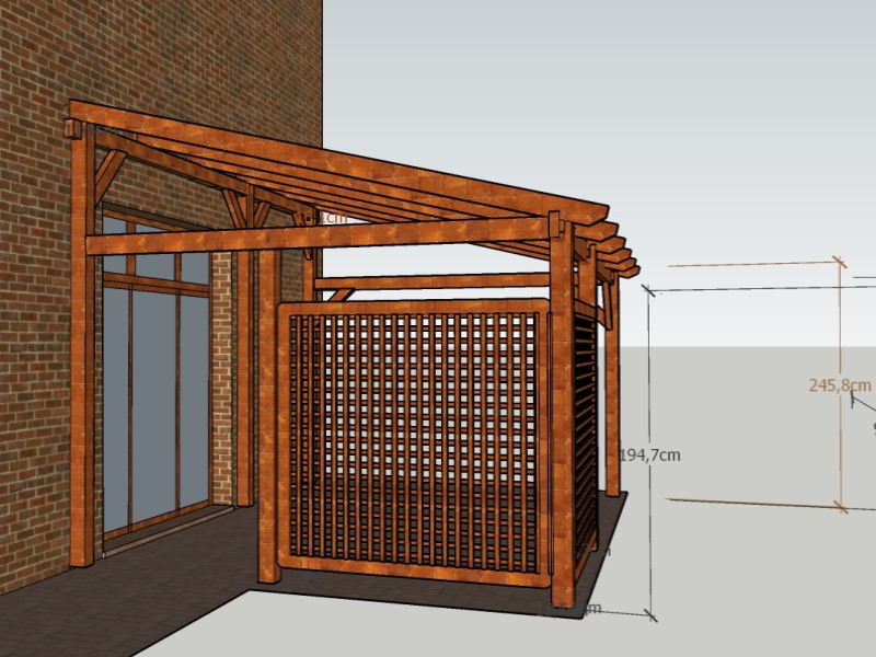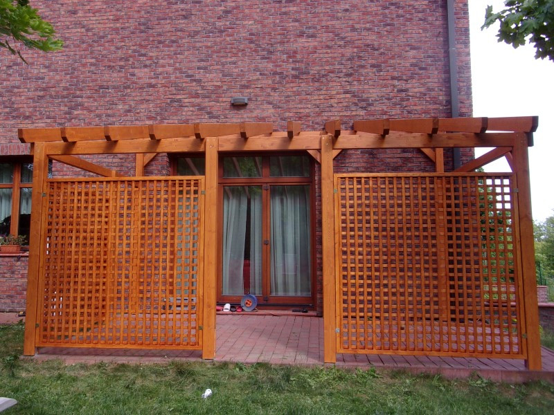 Pergolu jsme doplnili o tři mříže Eva o rozměru 180 × 180 cm, které plní dvojí funkci: poskytují přirozené soukromí při grilování či posezení a zároveň krásně ladí s celkovým stylem pergoly. Každá mříž je vyrobena ze sbíjeným spojem smrkových latí s velikostí oka 5 × 5 cm, zasazených do pevného rámu z hranolu 4 × 4 cm.