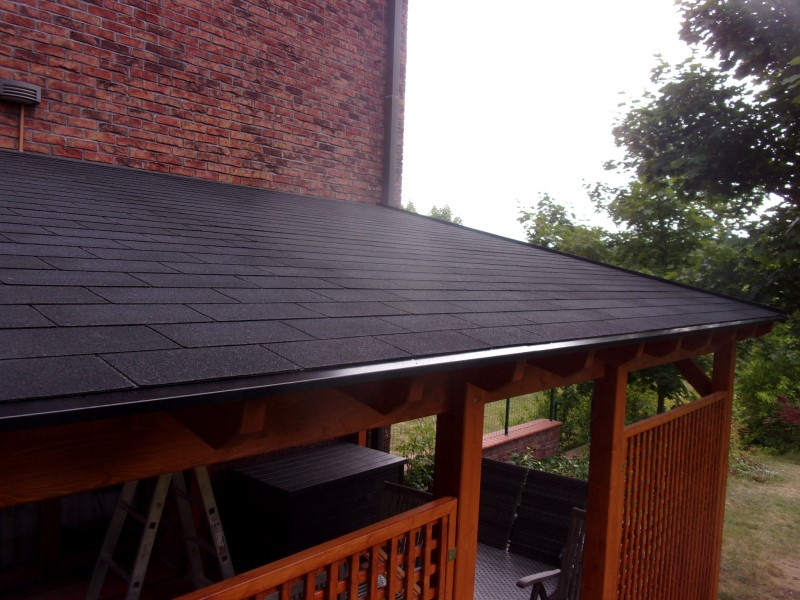 Po pečlivém sešroubování palubek následovala pokládka vodotěsné folie Ondutiss, která zajistí, že voda nepronikne dovnitř ani při silném dešti. Na tuto vrstvu jsme následně instalovali černý asfaltový šindel, který skvěle ladí s barvou stávajících doplňků u domu.