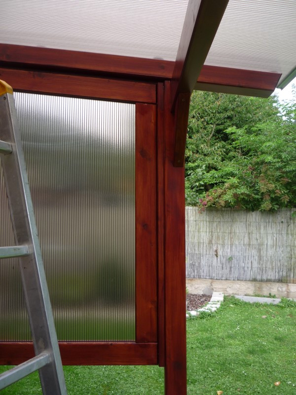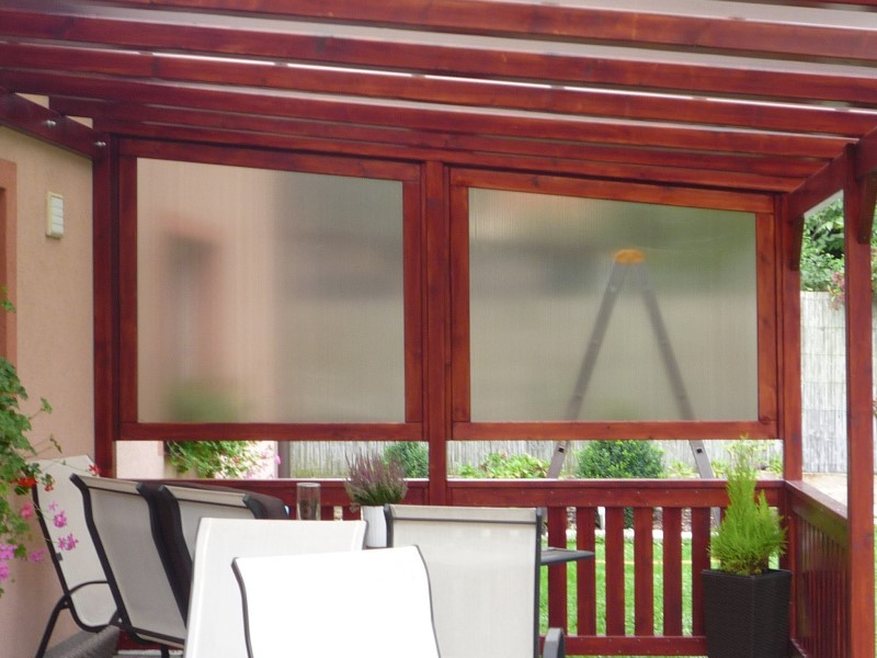 Jednu boční stranu dřevěné pergoly jsme uzavřeli kouřovým polykarbonátem, vsazeným do precizně zhotovených dřevěných rámů. Tato kombinace propouští světlo, ale zároveň chrání před větrem i zvědavými pohledy, v podstatě ideální řešení pro klidné posezení.
