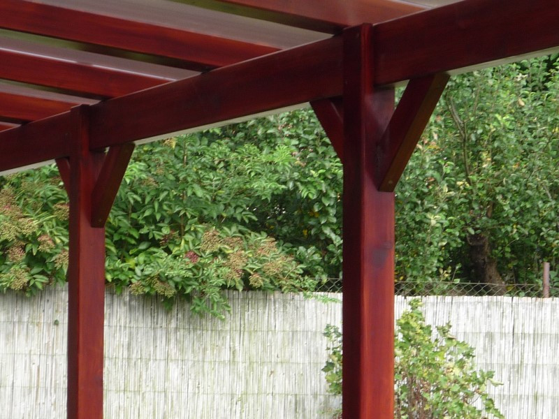 Povrchová úprava hranolů prken i latí ve zvoleném odstínu Oversol Rosewood dodala pergole konečný elegantní vzhled.