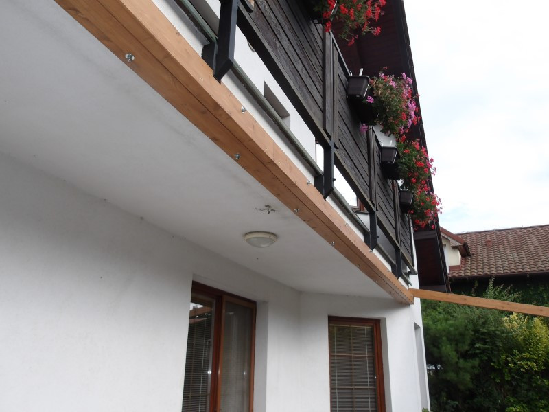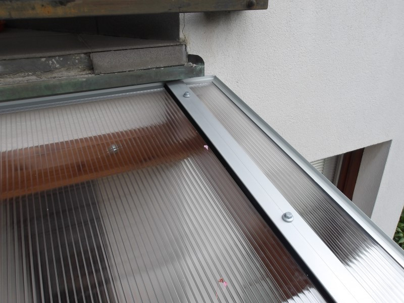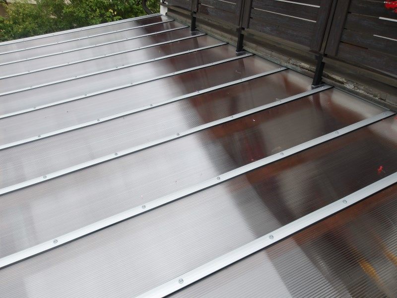 Střechu pergoly tvoří 8 mm silný čirý komůrkový polykarbonát, který na jednu stranu poskytuje dostatek světla, ale zároveň chrání před deštěm. K utěsnění střechy u podlahy balkonu jsme použili těsnící plech. K připevnění polykarbonátu na krokve jsme použili Al lišty s těsněním a Fasto šrouby s těsněním, podložkou a stříbrnou krytkou, samozřejmostí je i spodní těsnící mikropryž na krokvích pod polykarbonátem.