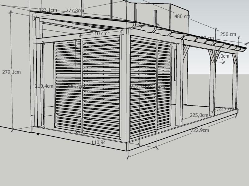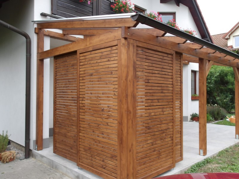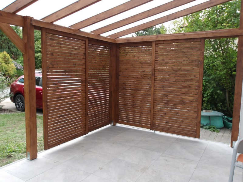Pergolu jsme doplnili o čtyři trelážové zástěny. Dvě pevné a dvě posuvné, které dodávají celé stavbě šmrnc a zároveň prakticky fungují jako větrná i pohledová clona. Každá dřevěná dělící stěna je o rozměru 110 × 205 cm.