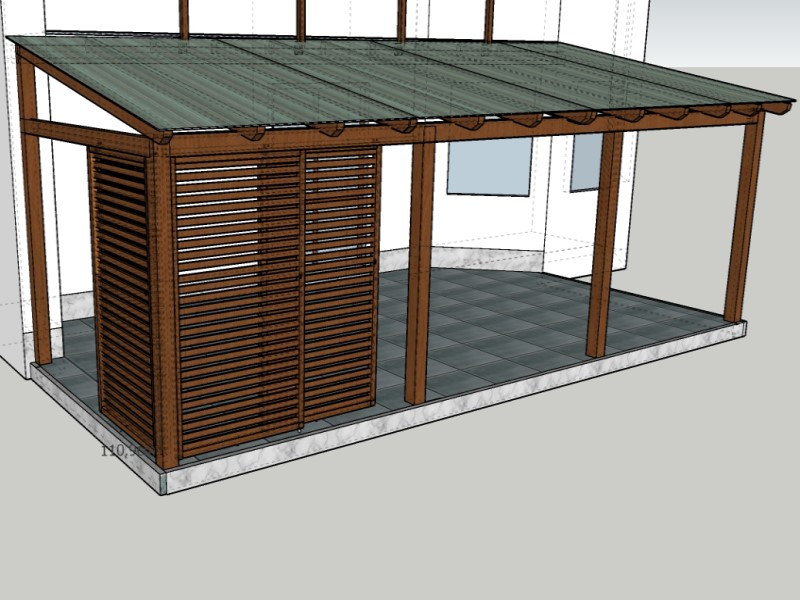 Přední hrana pultové střechy je zakončena hnědým plastovým okapovým setem se spádem do strany, takže i při vydatném dešti je prostor pod pergolou bezpečně chráněn.