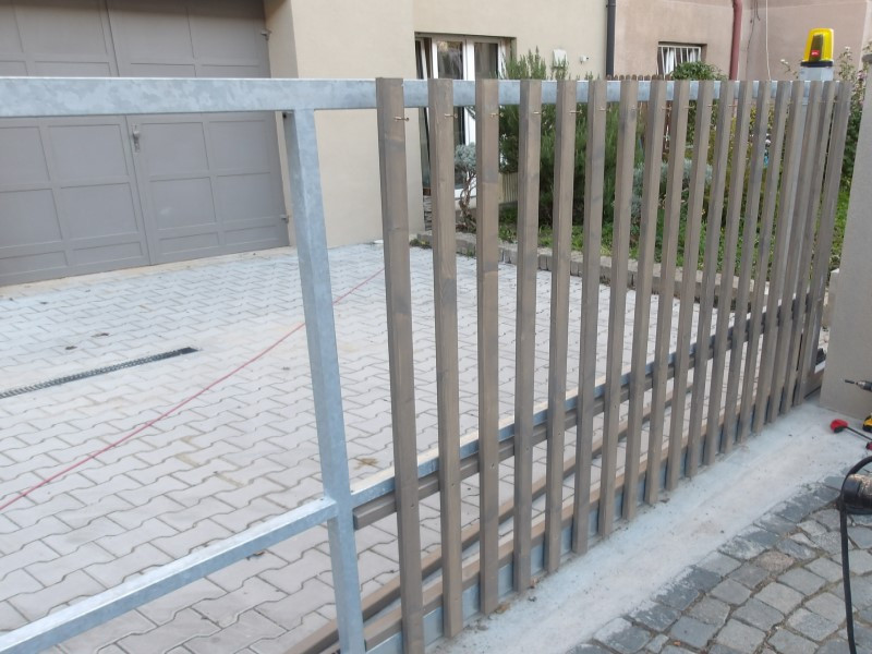 Součástí zakázky byla také nová vstupní branka a výměna hranolů u pojezdových vrat. Dřevěné prvky u branky a vrat jsme osadili do původních ocelových rámů z pozinkovaných profilů, což zaručilo pevnost, odolnost a minimální nároky na údržbu.