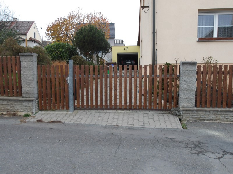 Pro pana Jiřího jsme vyrobili čtyři dlouhá plotová pole, která tvoří hlavní část oplocení, a dále jednu výplň vstupní branky a jednu výplň pojezdových vrat. Dřevo bylo následně povrchově ošetřeno lazurou v odstínu ořech, která zvýraznila přirozenou kresbu dřeva a poskytla mu dlouhodobou ochranu před povětrnostními vlivy. Nátěr dodává plotu nejen krásnou teplou barvu, ale i vyšší odolnost proti vlhkosti, UV záření a běžnému opotřebení.