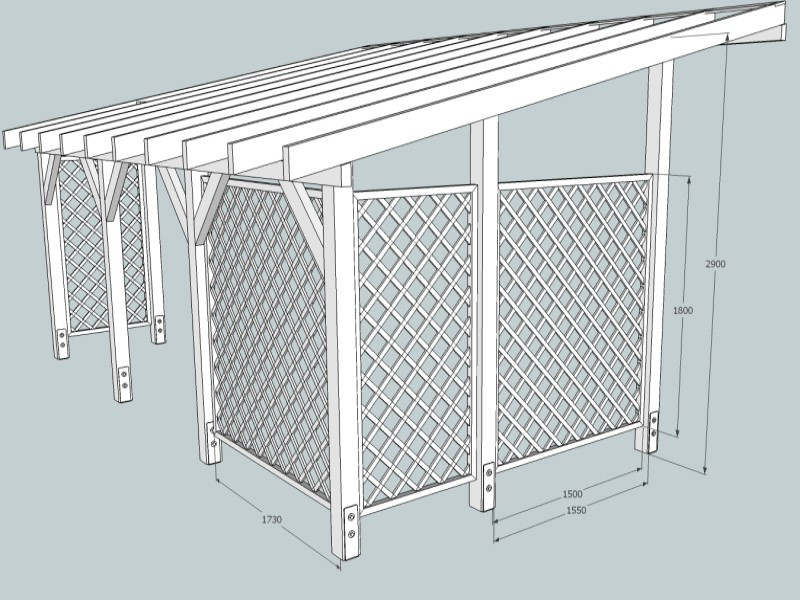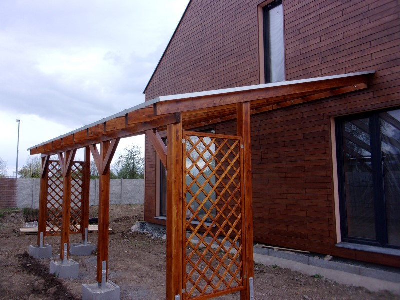 Dřevěná mříž byla vyrobena ze sušeného smrkového dřeva a povrchově upravena tenkovrstvou lazurou tak, aby perfektně ladila s původní konstrukcí pergoly Linda. Výsledný odstín sjednotil celkový vzhled a dřevěný dekor působí příjemně a harmonicky. Obě mříže jsme k pergolovým stojkám připevnili pomocí kovových úhelníků.
