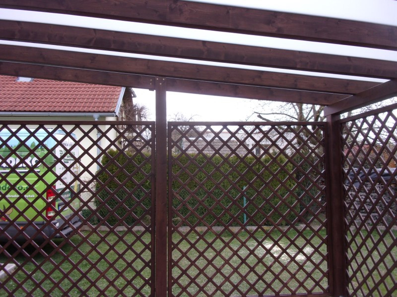 Dřevěná dělící stěna s horní mřížovou částí byla navržena naším technikem, protože toto řešení je u našich zákazníků velmi oblíbené. Po zvážení všech možností si však paní Helena vybrala jinou variantu. Rozhodla se, že místo plných dřevěných zástěn zvolí čistě mřížové řešení, které pergolu opticky nezatíží, ale přesto bude funkční. Volba padla na mříž typu Zuzana – klasiku, která nezklame.