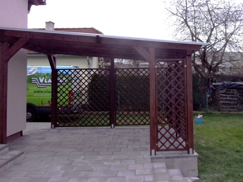 Do výroby šlo pět kusů mříží Zuzana v atypických rozměrech, které byly navrženy přesně mezi stojky zastřešené pergoly. Výroba proběhla v naší dobře vybavené truhlárně a následně byly všechny díly povrchově ošetřeny lazurou Tikkurila Valtti Plus Complete v krásném přírodním odstínu 5077. Lazura ochrání dřevo a prodlouží jeho životnost. Připravené mříže jsme dovezli na místo realizace a naši montéři je pečlivě připevněn ke stojkám pergoly pomocí kovových úhelníků.